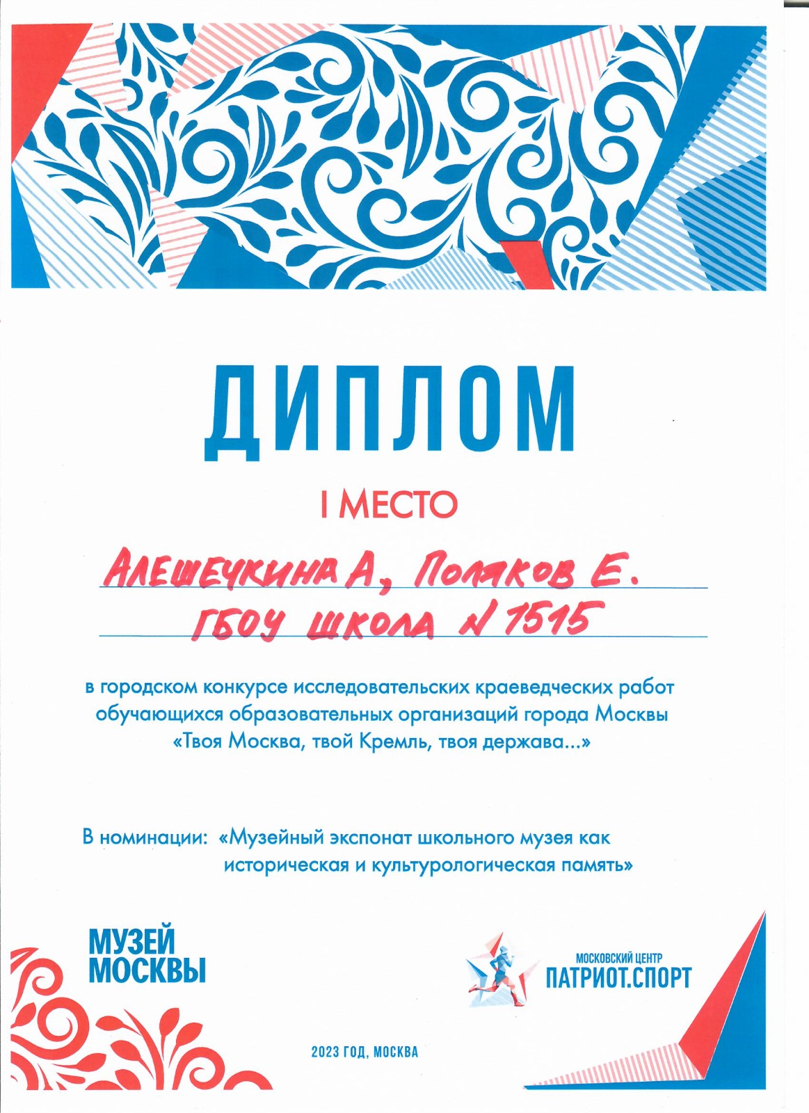 I место в городском конкурсе исследовательских краеведческих работ обучающихся образовательных организаций города Москва "Твоя Москва, твой Кремль, твоя держава..."
