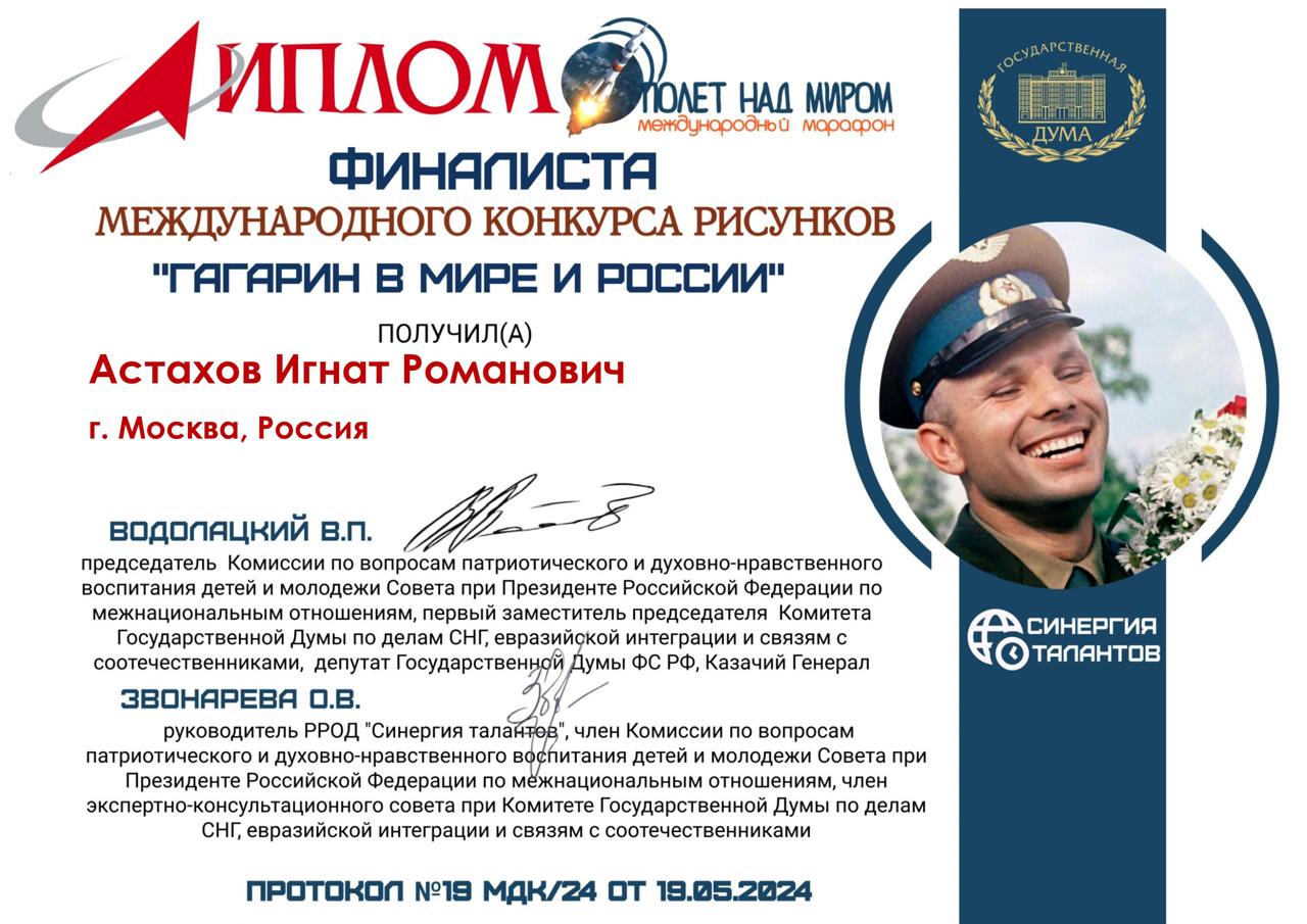 Ученик школы 1515 стал финалистом международного конкурса рисунков "Гагарин в мире России"