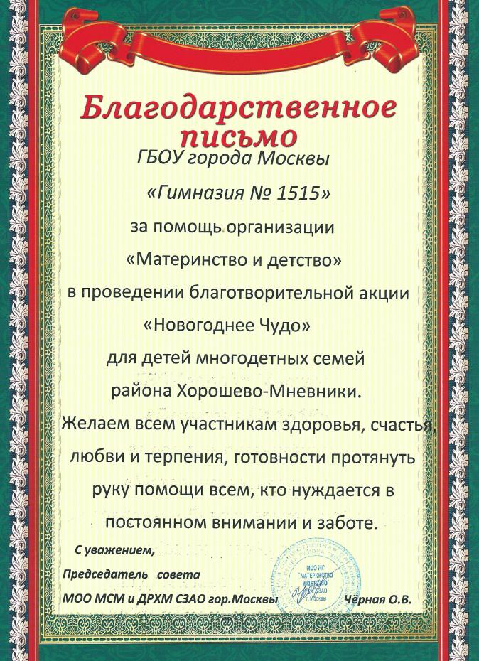 Общественная организация многодетных семей «Материнство и детство» района Хорошево-Мневники обратилась к образовательным учреждениям района с предложением об участии в благотворительной акции «Новогоднее чудо» для детей из малообеспеченных многодетных семей района.
